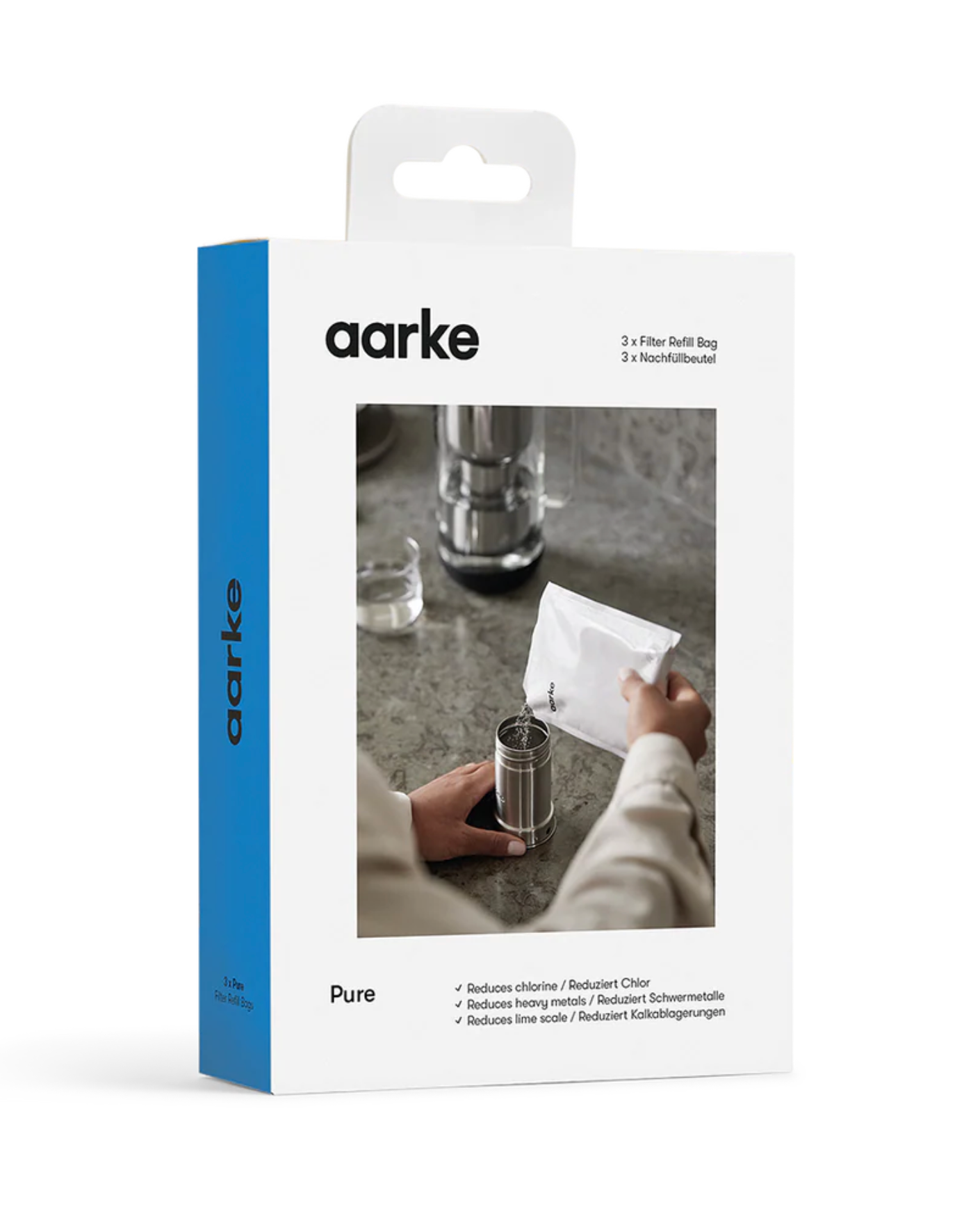 The Pure Filter Granules make your water softer, cleaner and tastier by reducing limescale, chlorine and heavy metals. Made exclusively for the Aarke Purifier technology, the granules in the bag are poured into the Purifier’s refillable water filter cartridge. Created in collaboration with BWT, one of the world’s leading water technology companies. Each bag filters up to 31,7 gallons of water and lasts up to 8 weeks.