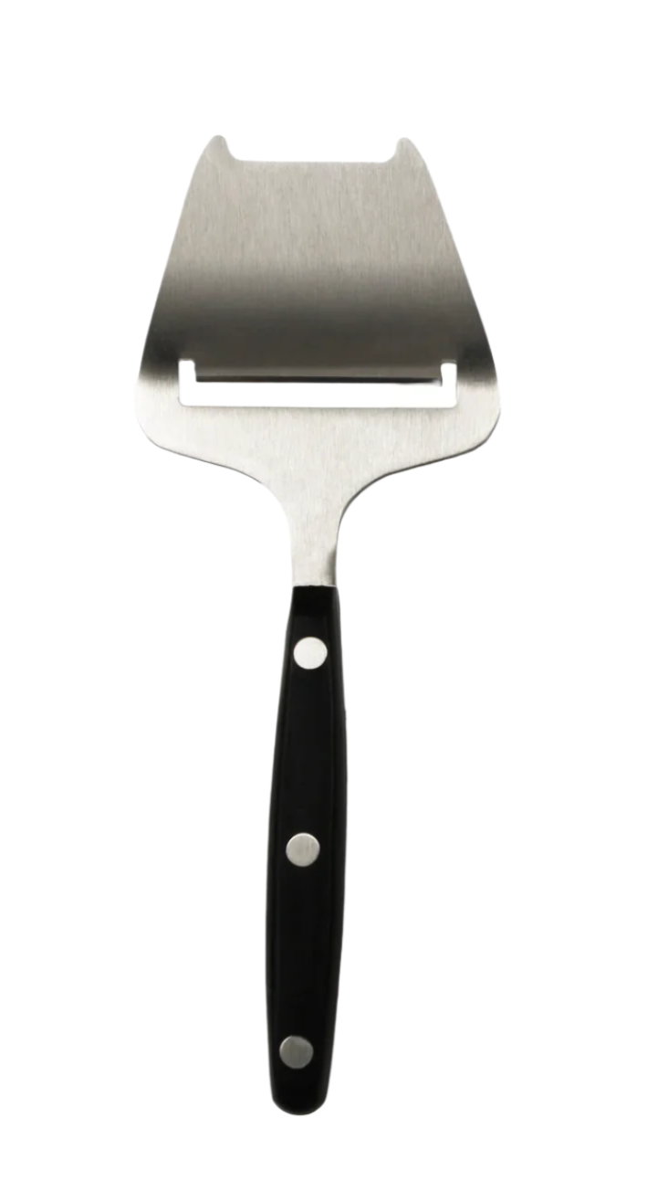 An assortment of cheese knives featuring a high-quality satin polished stainless-steel blade designed for a specific cheese type. The stylish full tang handles are constructed using a dense and durable plastic material, with stainless steel rivets.