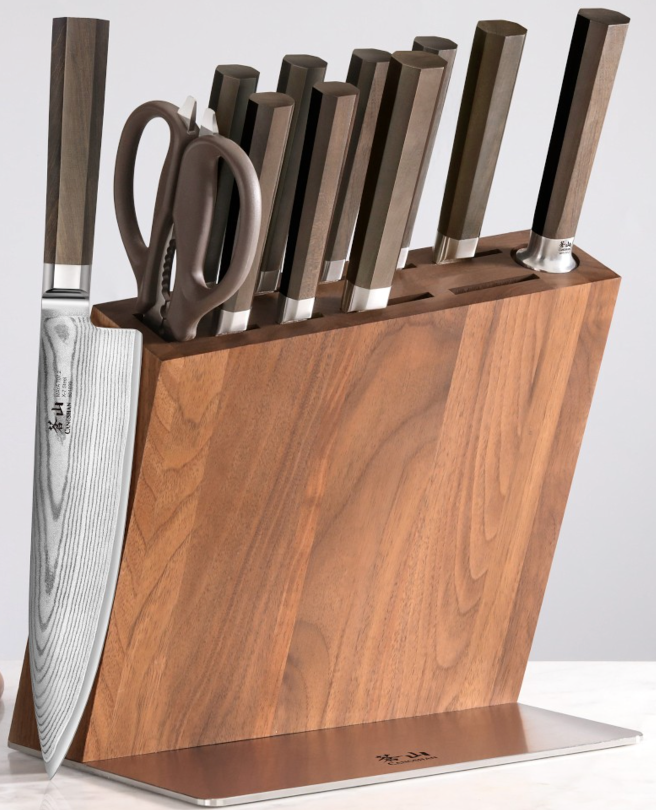 - Comes with solid walnut storage block that holds 11 knives, honing steel and shears.