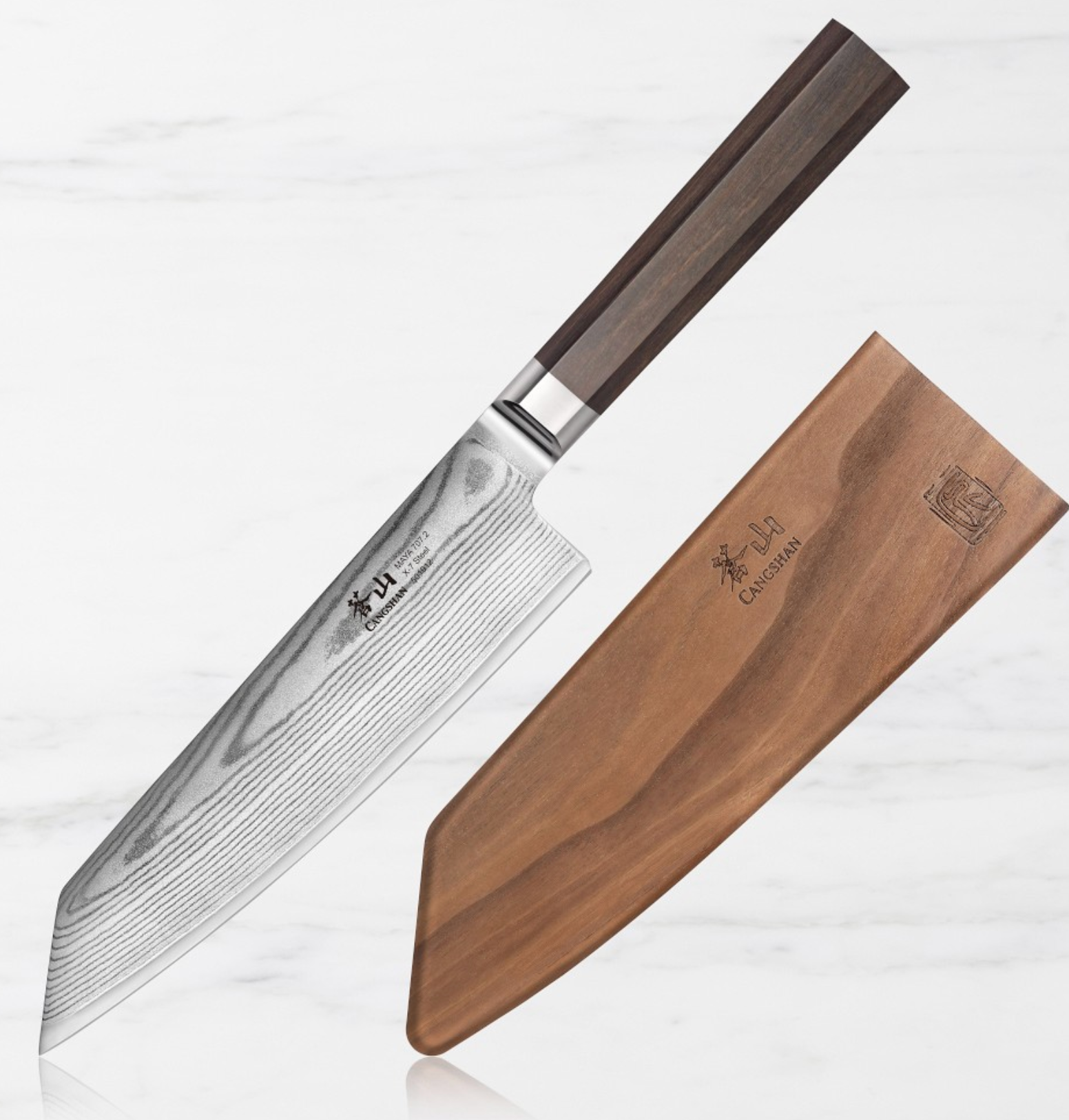 Handcrafted by award-winning cutlery maker Cangshan, the Maya collection is a celebration of beauty, precision and performance. The sleek knives feature razor-sharp blades forged from proprietary X-7 Damascus steel and comfortable handles made of African blackwood. Designed for precise prep, this knife has a long blade and angled tip that make it ideal for chopping vegetables and thinly slicing meat and fish.