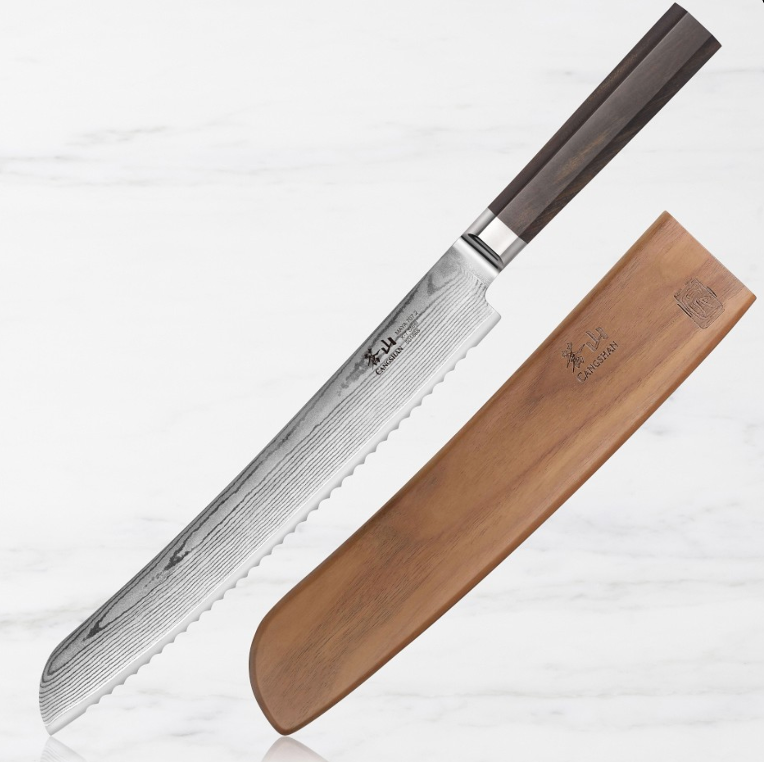 Handcrafted by award-winning cutlery maker Cangshan, the Maya collection is a celebration of beauty, precision and performance. The sleek knives feature razor-sharp blades forged from proprietary X-7 Damascus steel and comfortable handles made of African blackwood. Designed to slice bread, bagels and other baked goods, this knife has a long, serrated blade that cuts easily through crispy crusts without compressing soft interiors.
