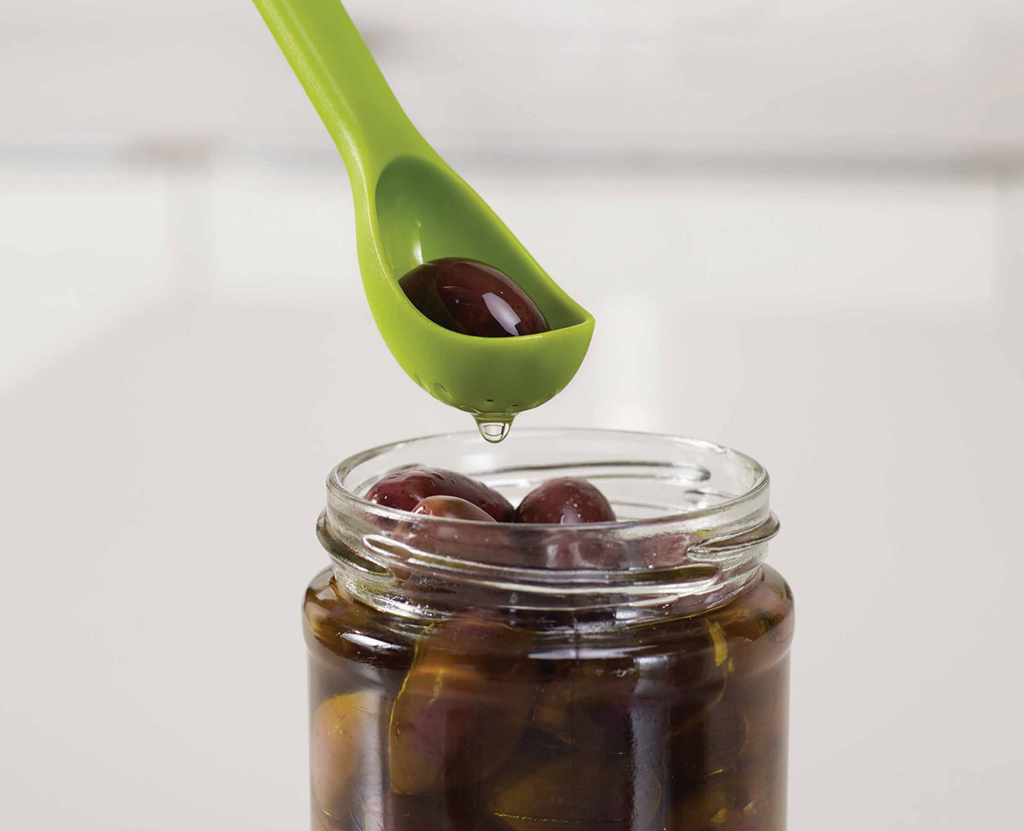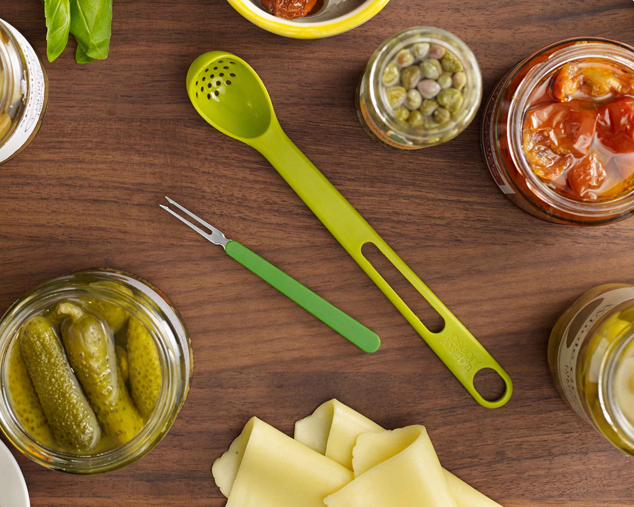 - Long handled slotted spoon ideal for scooping and draining from tall jars