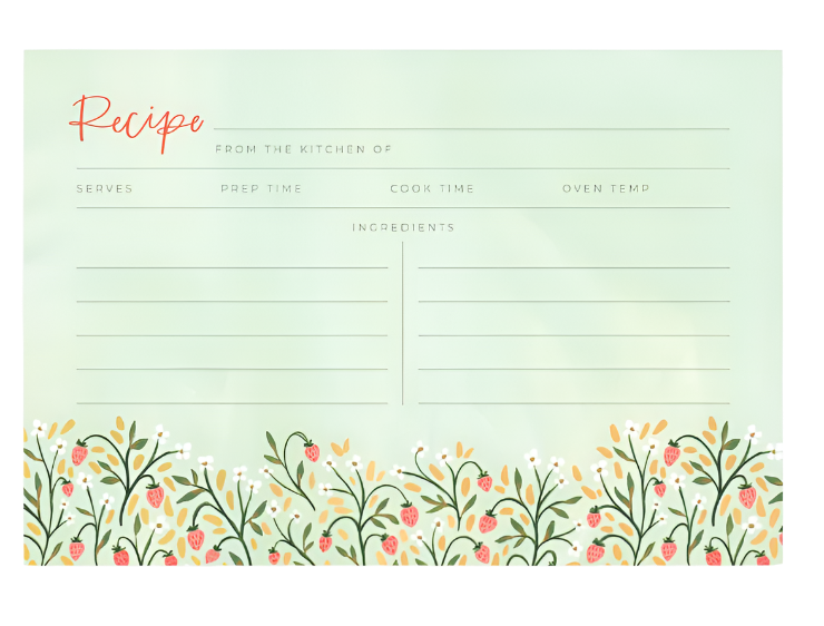Features | Hinged lid, metal bookplate on front, includes 15 Strawberry Meadow Recipe Cards and 1 pack of Dark Herringbone Recipe Divider Tabs